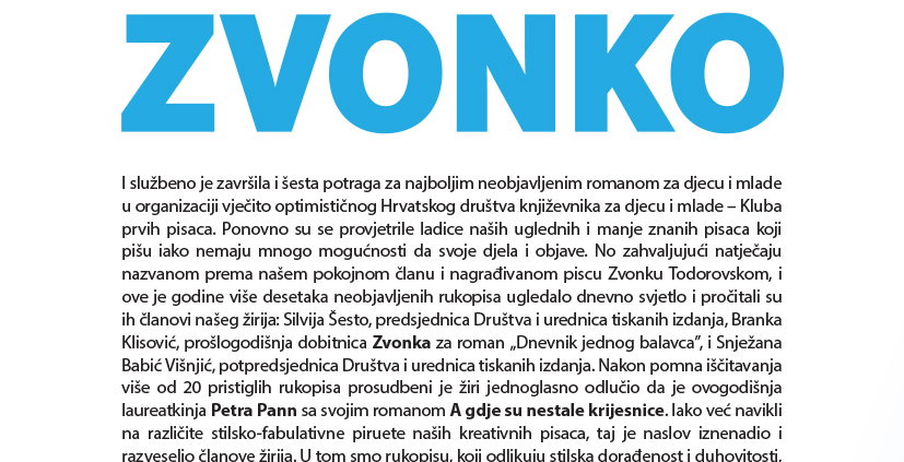 I službeno je završila i šesta potraga za najboljim neobjavljenim romanom za djecu i mlade u organizaciji vječito optimističnog Hrvatskog društva književnika za djecu i mlade – Kluba prvih pisaca. Ponovno su se provjetrile ladice naših uglednih i manje znanih pisaca koji pišu iako nemaju mnogo mogućnosti da svoje djela i objave. No zahvaljujući natječaju nazvanom prema našem pokojnom članu i nagrađivanom piscu Zvonku Todorovskom, i ove je godine više desetaka neobjavljenih rukopisa ugledalo dnevno svjetlo i pročitali su ih članovi našeg žirija: Silvija Šesto, predsjednica Društva i urednica tiskanih izdanja, Branka Klisović, prošlogodišnja dobitnica Zvonka za roman «Dnevnik jednog balavca», i Snježana Babić Višnjić, potpredsjednica Društva i urednica tiskanih izdanja. Nakon pomna iščitavanja više od 20 pristiglih rukopisa prosudbeni je žiri jednoglasno odlučio da je ovogodišnja laureatkinja Petra Pann sa svojim romanom ”A gdje su nestale krijesnice”. Iako već navikli na različite stilsko-fabulativne piruete naših kreativnih pisaca, taj je naslov iznenadio i razveselio članove žirija. U tom smo rukopisu, koji odlikuju stilska dorađenost i duhovitosti, ponovno našli odličan tekst nepoznate autorice koji ćemo sa zadovoljstvom dodati nizu bisera koje smo nanizali u nisku nagrađenih Zvonkom.