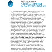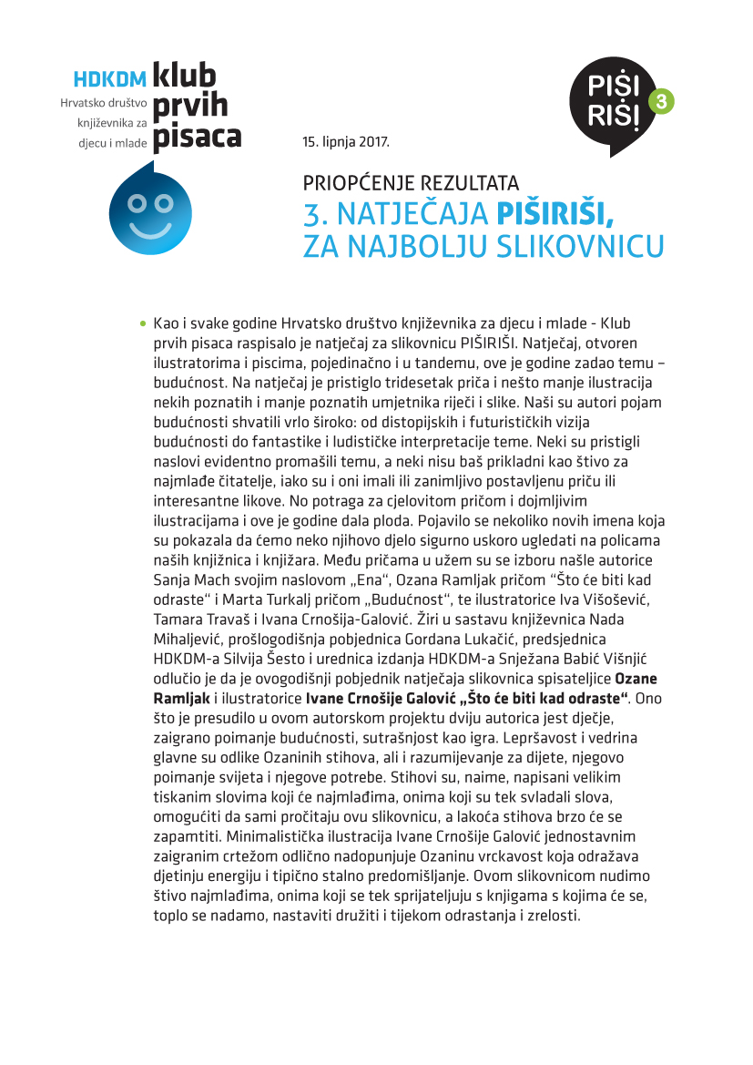 Kao i svake godine Hrvatsko društvo književnika za djecu i mlade – Klub prvih pisaca raspisalo je natječaj za slikovnicu Piširiši. Natječaj, otvoren ilustratorima i piscima, pojedinačno i u tandemu, ove je godine zadao temu – budućnost. Na natječaj je pristiglo tridesetak priča i nešto manje ilustracija nekih poznatih i manje poznatih umjetnika riječi i slike. Naši su autori pojam budućnosti shvatili vrlo široko: od distopijskih i futurističkih vizija budućnosti do fantastike i ludističke interpretacije teme. Neki su pristigli naslovi evidentno promašili temu, a neki nisu baš prikladni kao štivo za najmlađe čitatelje, iako su i oni imali ili zanimljivo postavljenu priču ili interesantne likove. No potraga za cjelovitom pričom i dojmljivim ilustracijama i ove je godine dala ploda. Pojavilo se nekoliko novih imena koja su pokazala da ćemo neko njihovo djelo sigurno uskoro ugledati na policama naših knjižnica i knjižara. Među pričama u užem su se izboru našle autorice Sanja Mach svojim naslovom „Ena“, Ozana Ramljak pričom “Što će biti kad odraste“ i Marta Turkalj pričom „Budućnost“, te ilustratorice Iva Višošević, Tamara Travaš i Ivana Crnošija-Galović. Žiri u sastavu književnica Nada Mihaljević, prošlogodišnja pobjednica Goga Lukačić, predsjednica HDKDM-a Silvija Šesto i urednica izdanja HDKDM-a Snježana Babić Višnjić odlučio je da je ovogodišnji pobjednik natječaja slikovnica spisateljice Ozane Ramljak i ilustratorice Ivane Crnošije Galović „Što će biti kad odraste“. Ono što je presudilo u ovom autorskom projektu dviju autorica jest dječje, zaigrano poimanje budućnosti, sutrašnjost kao igra. Lepršavost i vedrina glavne su odlike Ozaninih stihova, ali i razumijevanje za dijete, njegovo poimanje svijeta i njegove potrebe. Stihovi su, naime, napisani velikim tiskanim slovima koji će najmlađima, onima koji su tek svladali slova, omogućiti da sami pročitaju ovu slikovnicu, a lakoća stihova brzo će se zapamtiti. Minimalistička ilustracija Ivane Crnošije Galović jednostavnim zaigranim crtežom odlično nadopunjuje Ozaninu vrckavost koja odražava djetinju energiju i tipično stalno predomišljanje. Ovom slikovnicom nudimo štivo najmlađima, onima koji se tek sprijateljuju s knjigama s kojima će se, toplo se nadamo, nastaviti družiti i tijekom odrastanja i zrelosti.