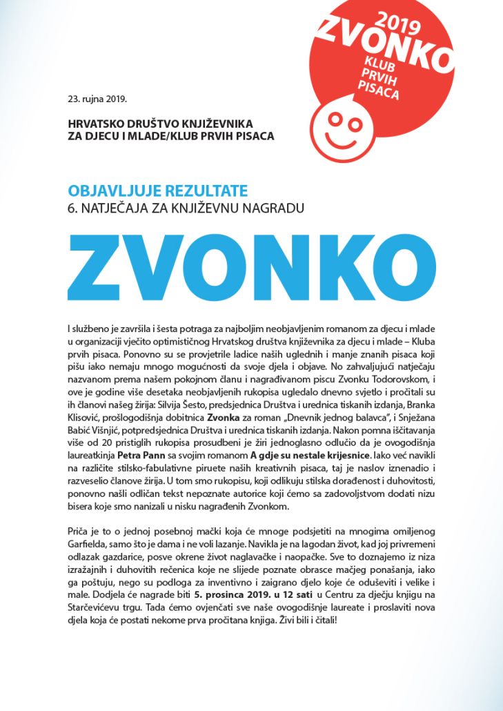 I službeno je završila i šesta potraga za najboljim neobjavljenim romanom za djecu i mlade u organizaciji vječito optimističnog Hrvatskog društva književnika za djecu i mlade – Kluba prvih pisaca. Ponovno su se provjetrile ladice naših uglednih i manje znanih pisaca koji pišu iako nemaju mnogo mogućnosti da svoje djela i objave. No zahvaljujući natječaju nazvanom prema našem pokojnom članu i nagrađivanom piscu Zvonku Todorovskom, i ove je godine više desetaka neobjavljenih rukopisa ugledalo dnevno svjetlo i pročitali su ih članovi našeg žirija: Silvija Šesto, predsjednica Društva i urednica tiskanih izdanja, Branka Klisović, prošlogodišnja dobitnica Zvonka za roman «Dnevnik jednog balavca», i Snježana Babić Višnjić, potpredsjednica Društva i urednica tiskanih izdanja. Nakon pomna iščitavanja više od 20 pristiglih rukopisa prosudbeni je žiri jednoglasno odlučio da je ovogodišnja laureatkinja Petra Pann sa svojim romanom ”A gdje su nestale krijesnice”. Iako već navikli na različite stilsko-fabulativne piruete naših kreativnih pisaca, taj je naslov iznenadio i razveselio članove žirija. U tom smo rukopisu, koji odlikuju stilska dorađenost i duhovitosti, ponovno našli odličan tekst nepoznate autorice koji ćemo sa zadovoljstvom dodati nizu bisera koje smo nanizali u nisku nagrađenih Zvonkom.