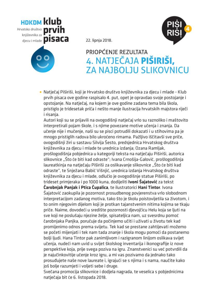 Autori koji su se prijavili na ovogodišnji natječaj vrlo su raznoliko i maštovito interpretirali pojam škole, i s njime povezane motive učenja i znanja. Da učenje nije i mučenje, naši su se pisci potrudili dokazati i u stihovima pa je mnogo pristiglih radova bilo ukroćeno rimama. Pažljivo iščitavši sve priče, ovogodišnji žiri u sastavu Silvija Šesto, predsjednica Hrvatskog društva književnika za djecu i mlade te urednica izdanja; Ozana Ramljak, prošlogodišnja pobjednica u kategoriji teksta na natječaju Piširiši, autorica slikovnice “Što će biti kad odraste”; Ivana Crnošija-Galović, prošlogodišnja laureatkinja na natječaju Piširiši za oslikavanje slikovnice “Što će biti kad odraste”, te Snježana Babić Višnjić, urednica izdanja Hrvatskog društva književnika za djecu i mlade, odlučio je ovogodišnje statue Piširiši, po trideset primjeraka i po 1000 kuna, dodijeliti Ivoni Šajatović za tekst Čarobnjak Panjak i Ptica Čupalica, te ilustratorici Hani Tintor. Ivona Šajatović zaokupila je pozornost prosudbenog povjerenstva vrlo slobodnom interpretacijom zadanog motiva, tako što je školu poistovijetila sa životom, i to onim njegovim dijelom koji je protkan tajanstvenim nitima kojima se tkaju priče. Naime, dovodeći u središte pozornosti djevojčicu Helu koja se ljuti na sve koji ne poslušaju njezine želje, spisateljica nam, uz svesrdnu pomoć čarobnjaka Panjka, poručuje da počinjemo učiti i uživati u životu tek kad promijenimo odnos prema svijetu. Tek kad se prestane zahtijevati možemo se početi mijenjati i tek nam tada znanje i škola mogu pomoći da postanemo bolji ljudi. Hana Tintor pak zanimljivom i razigranom linijom oslikava svijet učenja, nudeći nam uvid u svijet školskog inventarija i ikonografije iz nove perspektive koja, prije svega poziva na igru. Znanstvenici su već potvrdili da je najučinkovitije učenje kroz igru, a mi vas pozivamo da jednako tako prosuđujete naše nove laureate i, igrajući se s njima i s nama, naučite kako još bolje razumjeti i voljeti sebe i druge.